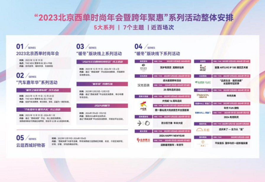 “2023北京西单时尚年会暨跨年聚惠”系列活动将推出五大系列、七个主题、近百场次活动,线上线下双渠道,打造消费体验新地标。五大系列以2023北京西单时尚年会为开端,陆续接力“汽车嘉年华”、“暖冬”版块线上系列活动、“暖冬”版块线下系列活动、云逛西城好物荟几大系列活动,统筹近千万资金,投放消费券、释放福利,一直持续到2024年1月中下旬。